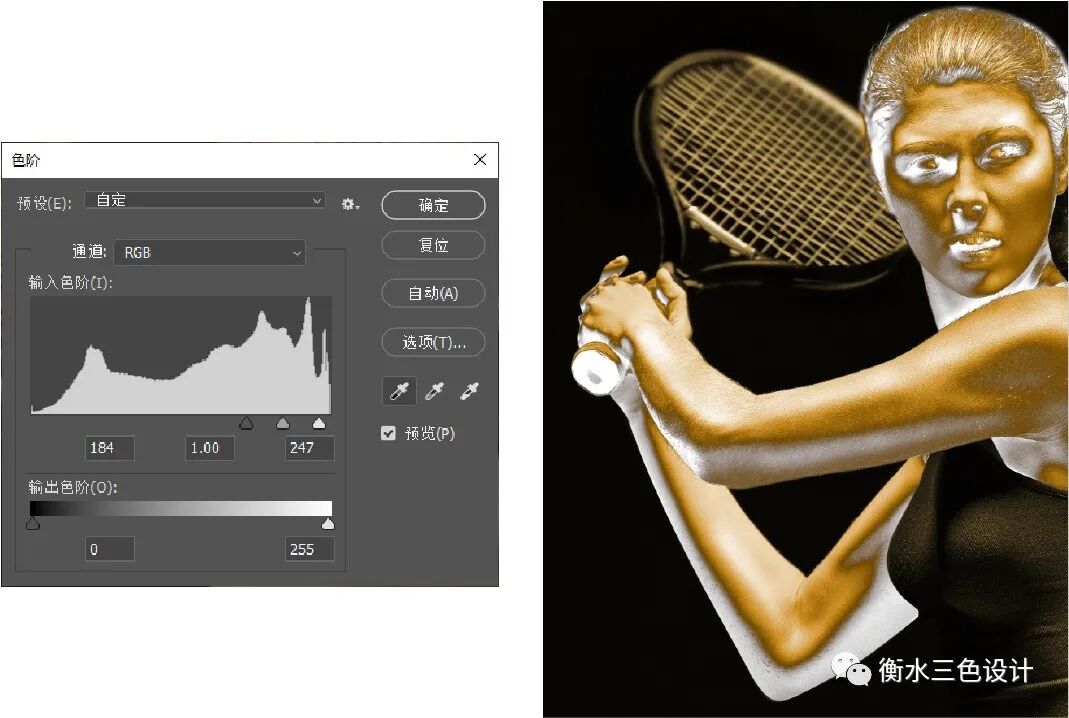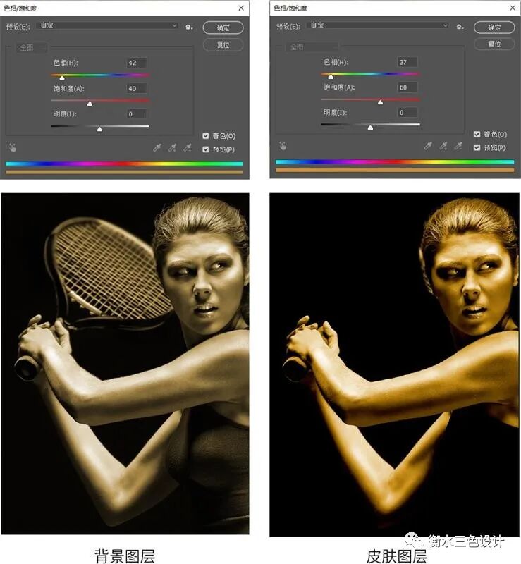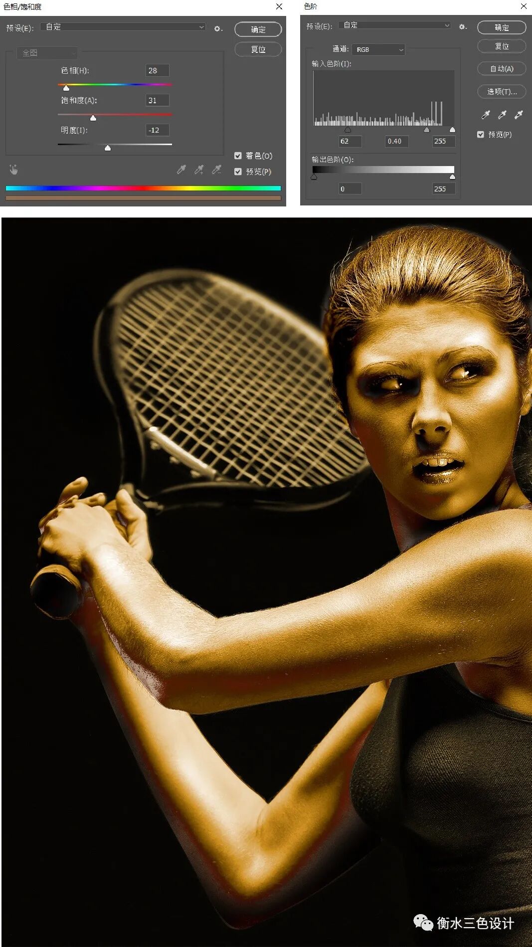 分别给两个图层使用「色相/饱和度」,勾选「着色」,调整为金色调。皮肤图层使用「色阶」命令增强对比度,