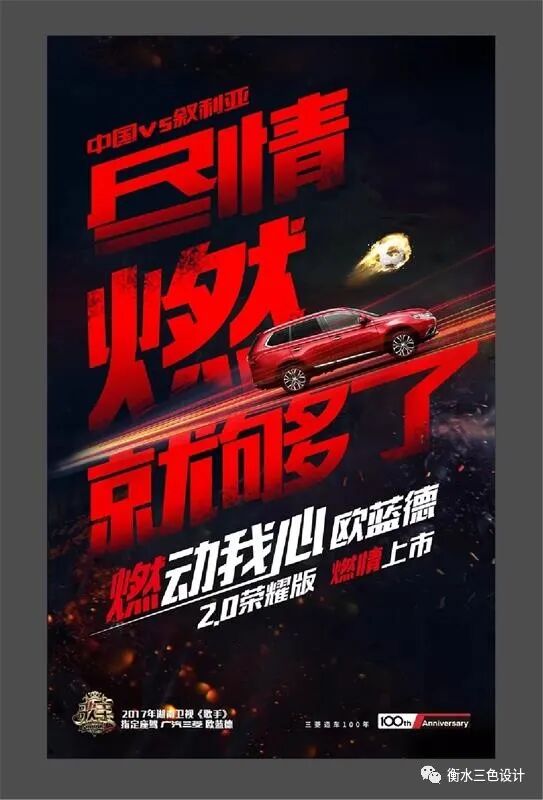 方案三参考一则汽车海报,将文字加入倾斜角度变化,通过不平衡感产生了「动感」,增强了版面的趣味性,也产生良好的视觉冲击力。