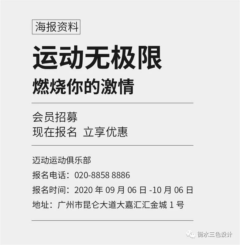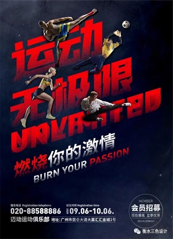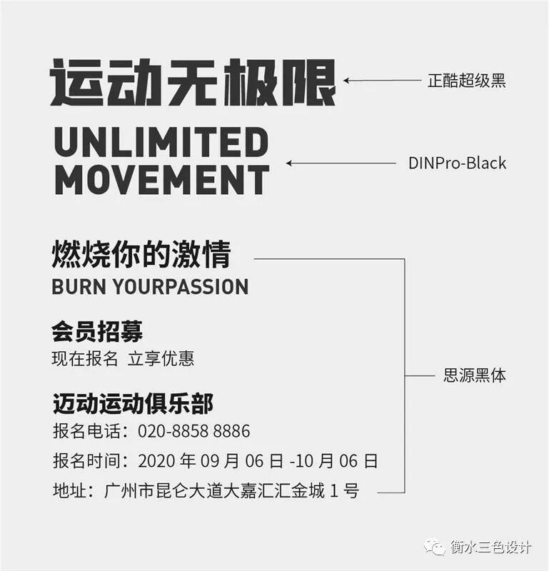 海报主题为运动俱乐部的宣传海报,首先选择与版面相契合的字体。主标题中文字体选择「字魂-正酷超级黑」,英文和数字字体选择「DINPro-Black」,两款字体有着相似的特征,笔画厚重,棱角分明,粗犷而具有力量感。其他信息使用严谨规整的「思源黑体」,保证良好的识别性。