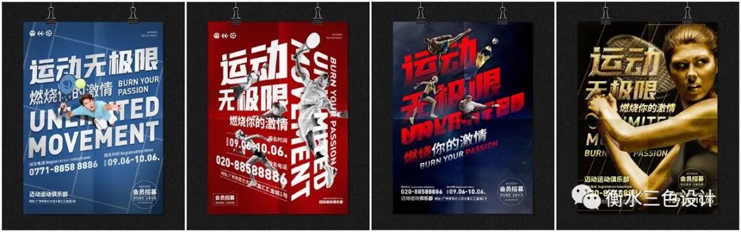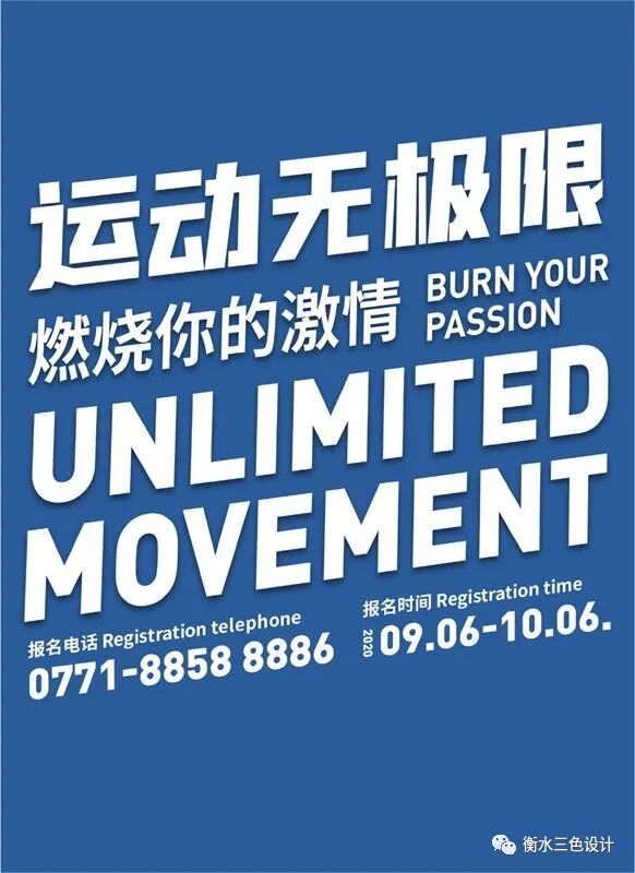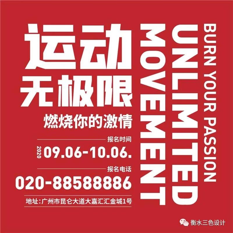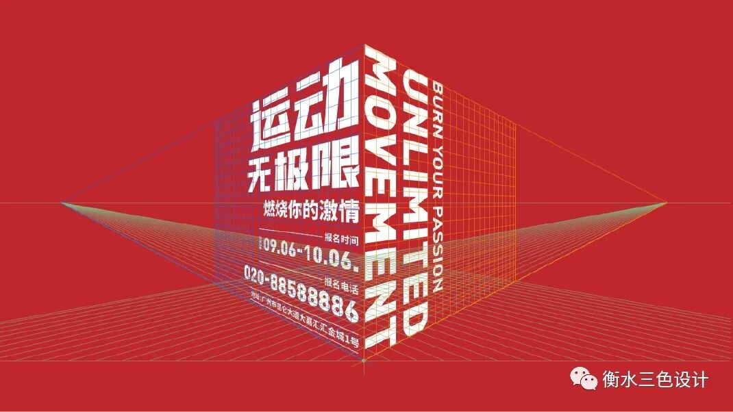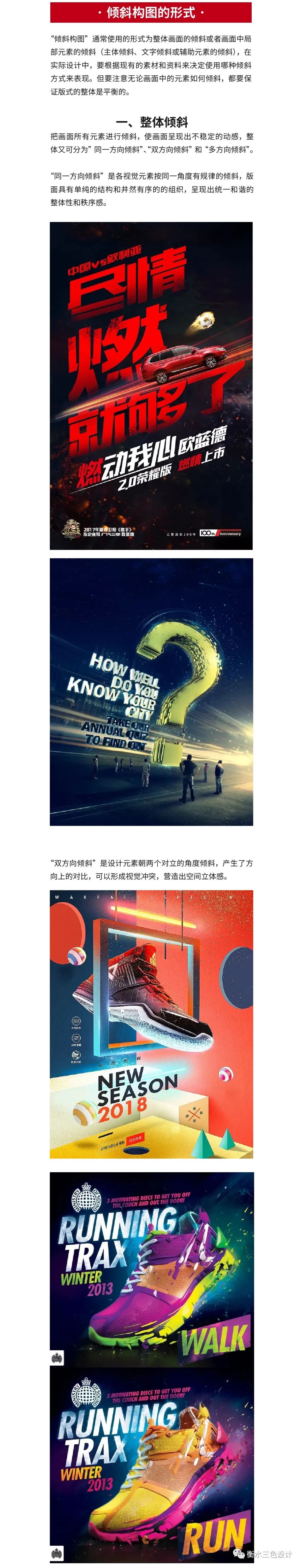 「倾斜构图」是版面整体或部分元素以倾斜的角度呈现在画面上,可以产生不稳定的动感,画面显得更具创意性,充满活力,也更有视觉冲击力。为了让大家加深对倾斜构图的理解,运用以上知识点进行一则运动海报实操演示。