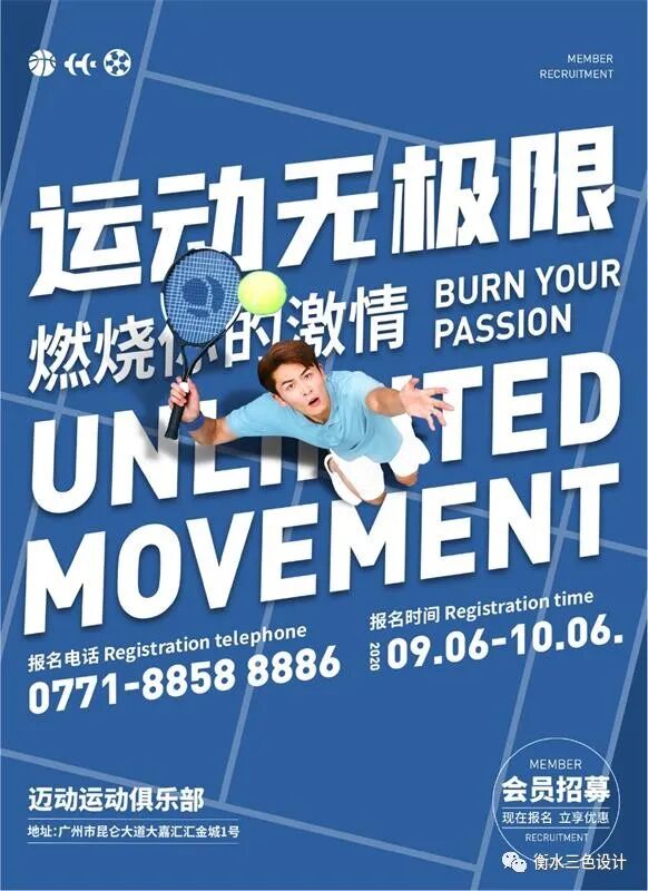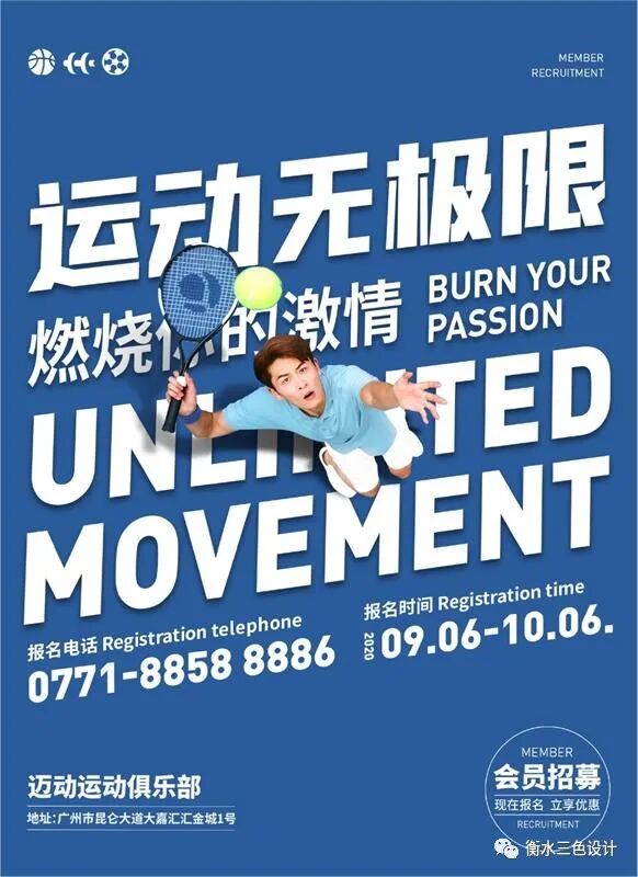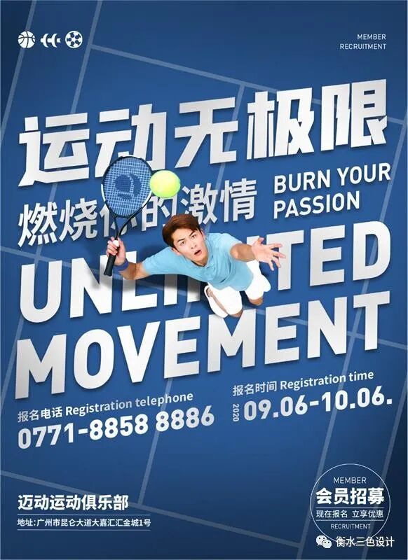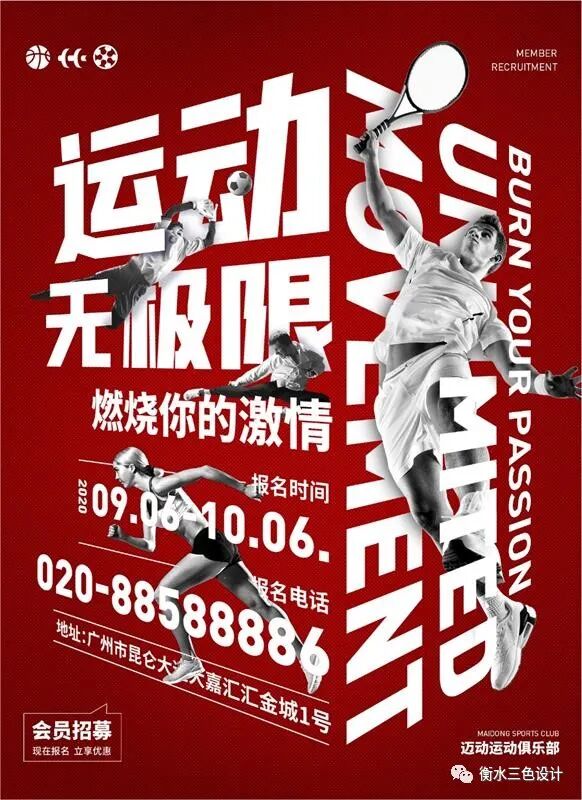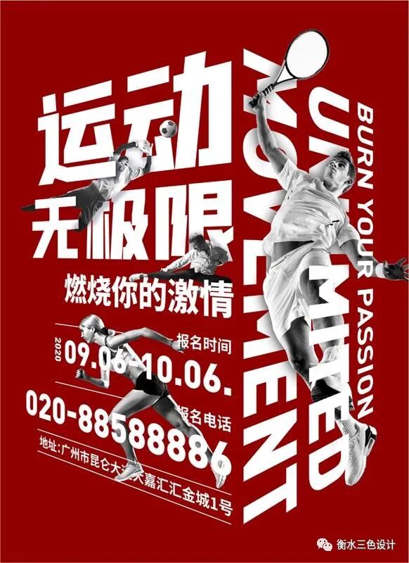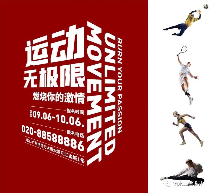 加入俯视角度的运动人物素材,注意尽量不要影响中文标题的识别性。并把其他信息和点缀元素平稳的排列在画面四角,形成动静对比,也可以保持画面的稳定性。