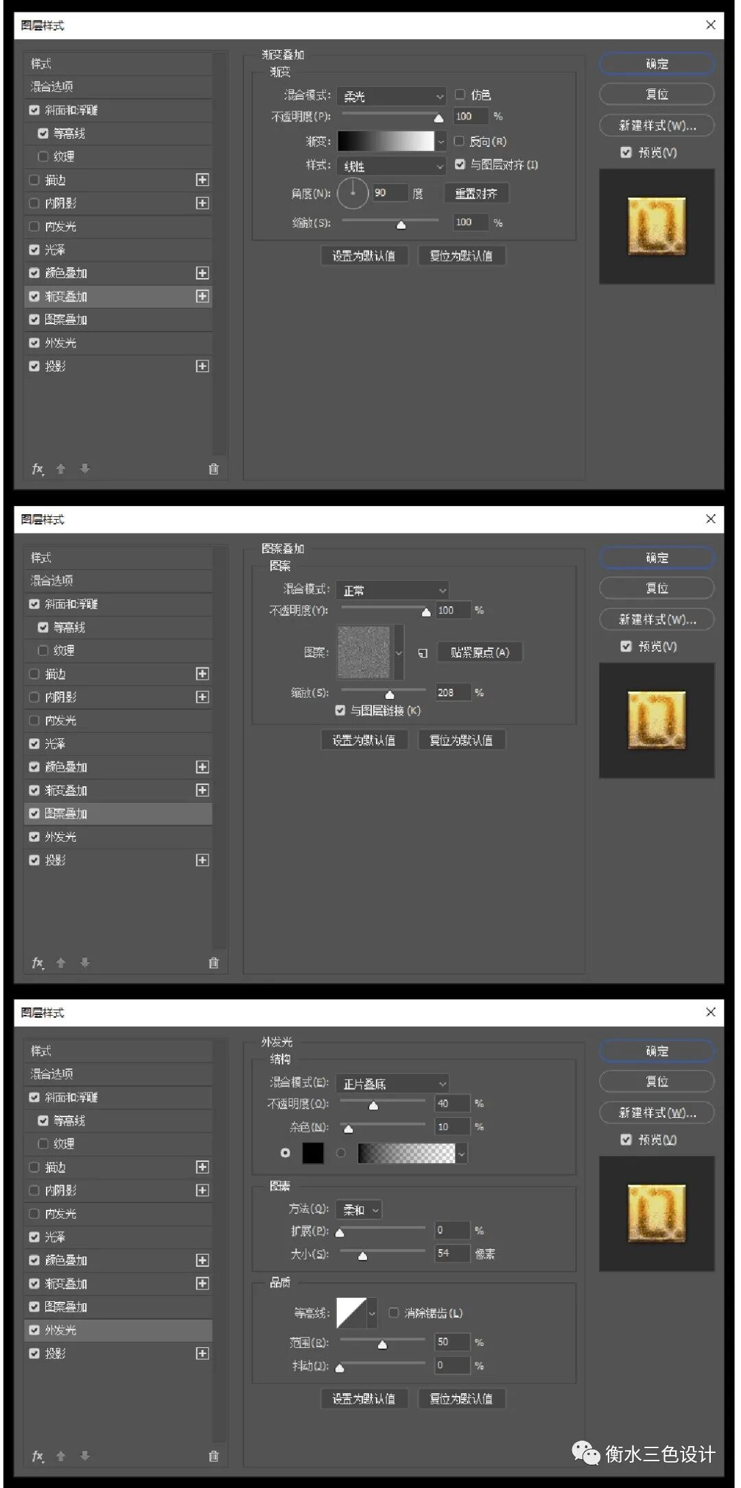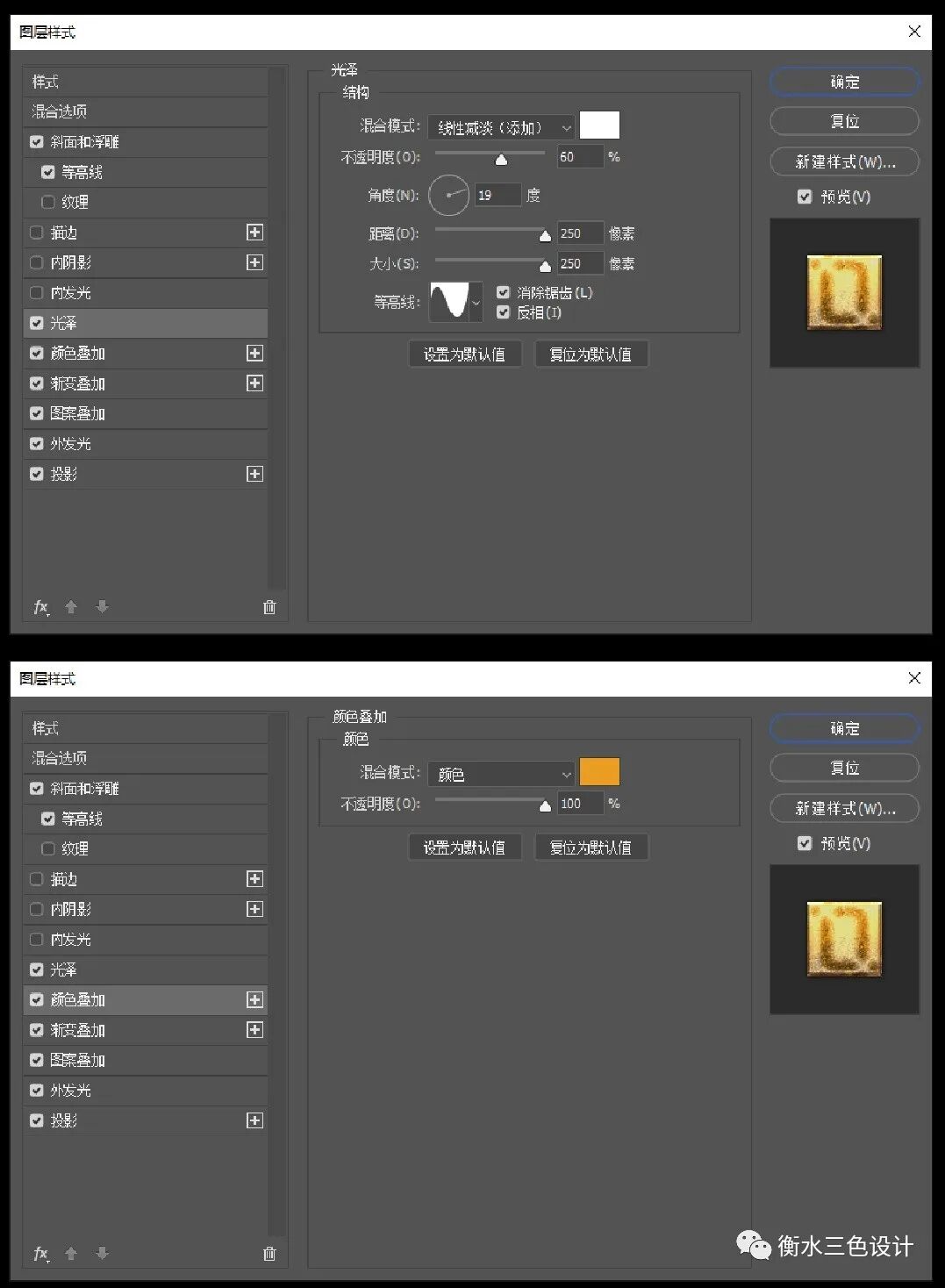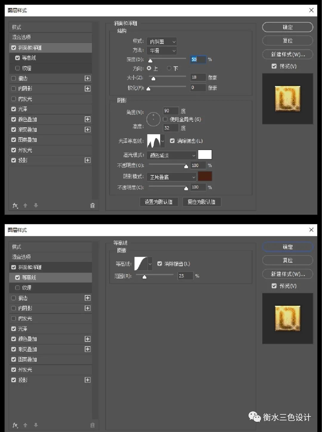使用「图层样式」给文字加入金属特效,参考数值如下: