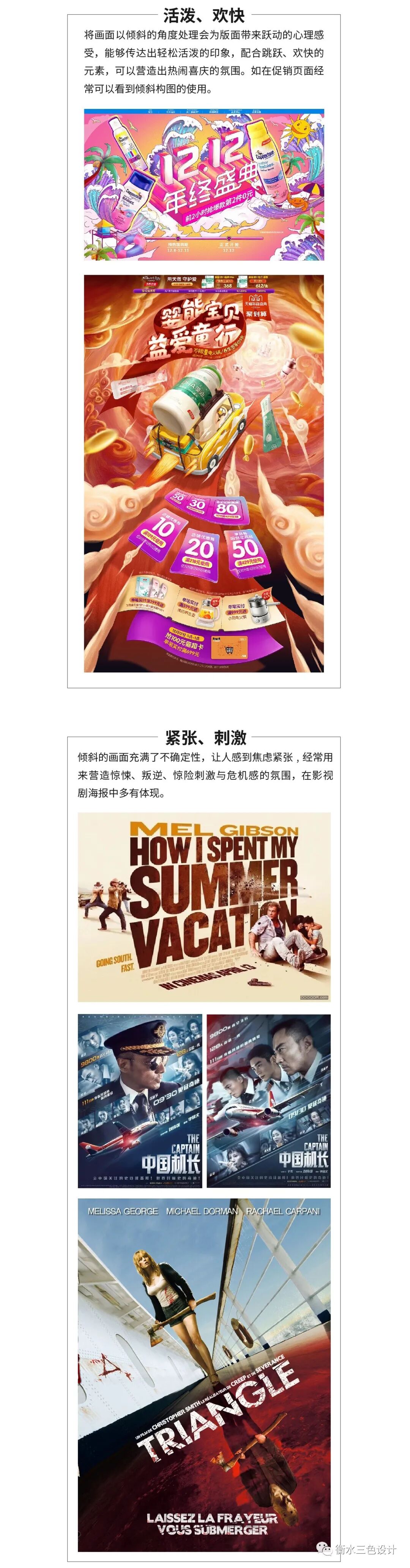 「倾斜构图」可以打破常规构图横平竖直的视觉思维,产生不稳定的动感,画面显得更具创意性,也更有视觉冲击力。当想要设计灵动活泼的版面,营造轻松、动感、刺激等氛围时,「倾斜构图」是更适合运用的构图表现形式。