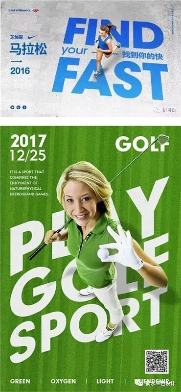 在进行设计前,可以寻找关于运动的优秀案例进行分析,参考其图片选取、色彩搭配、空间构图等。方案一参考的是采用高视角俯视角度的案例,使用人物和倾斜的文字营造特殊的空间感,能够给人带来的崭新视觉印象。