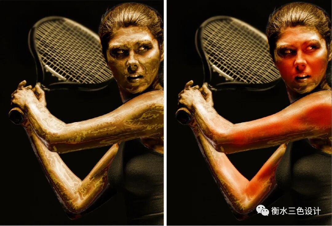 接下来给皮肤加强金属质感,复制皮肤图层移动到图层最上方,执行「滤镜-滤镜库-素描-铬黄渐变」,图层混合模式改为「柔光」,降低图层透明度50%,擦除红色部分。